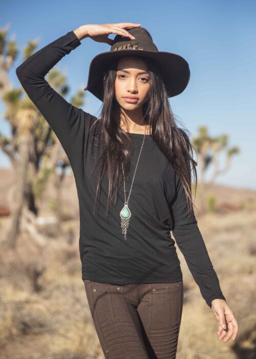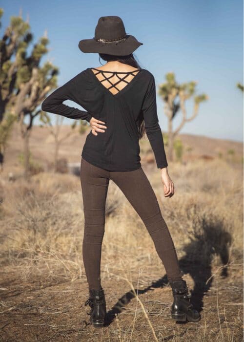 It’s no mystery why this is the greatest longsleeve of the season: It’s all about the badass batwing backness of it all. V-back has a cool criss cross woven back. In our light-as-anything Hemp Lyocell that makes every gal let out a long slow ahhhh of delight.