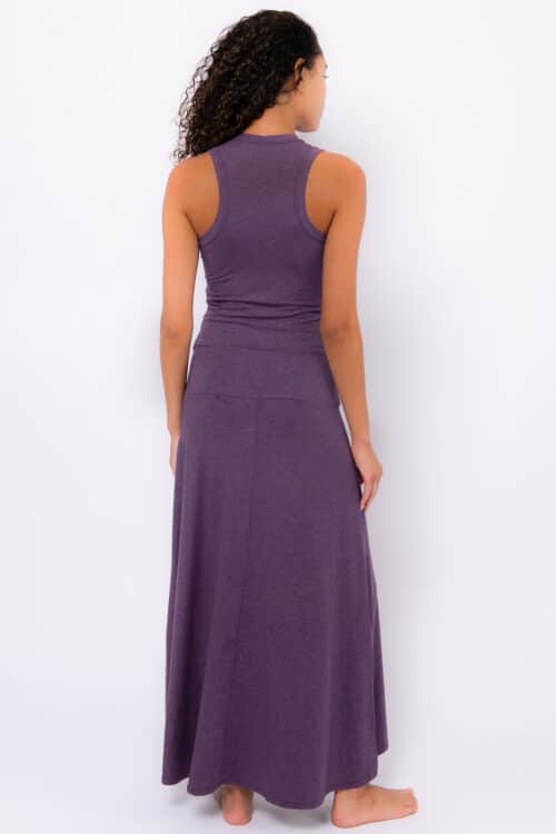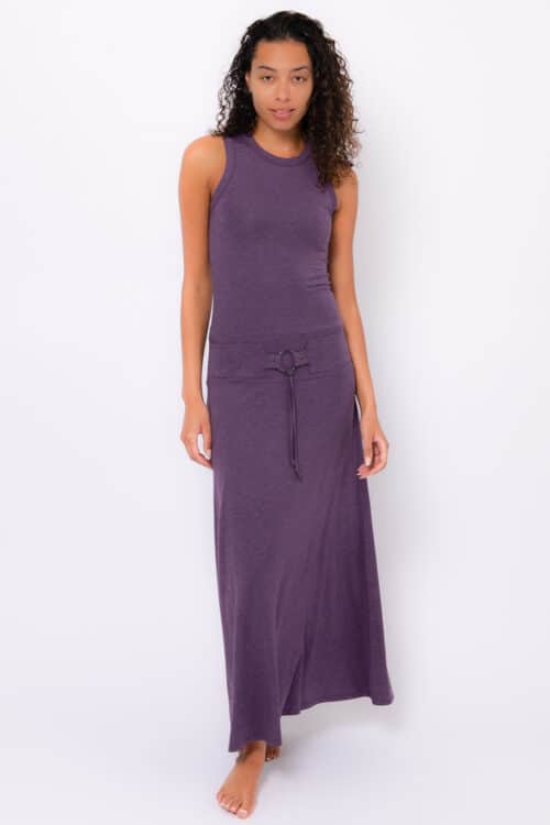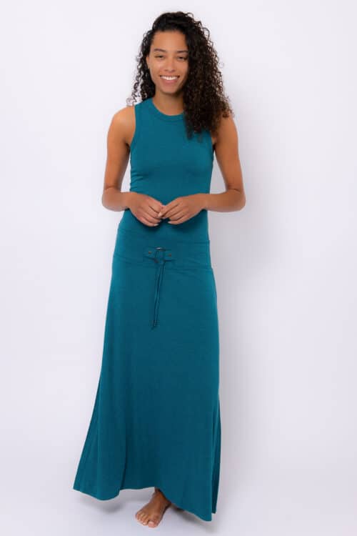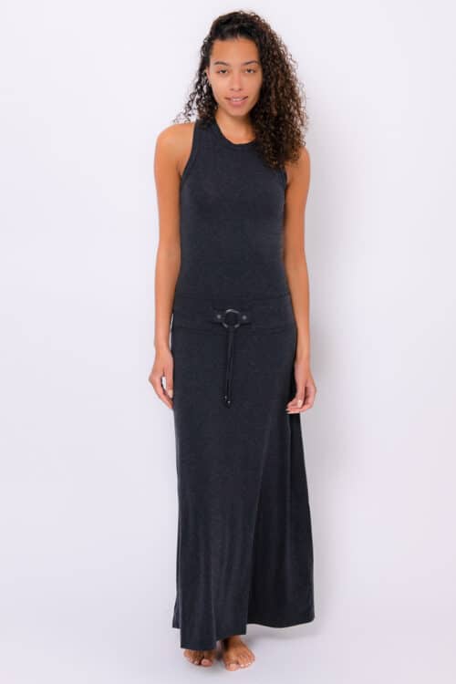 Like a cool drink of water from a crystal spring, our Thalia Dress in Bamboo Melange will quench your thirst for an elegant sustainable maxi dress for all seasons. Casual enough for the day, with a simple scoop neck and wide T back, but dress it up and it’s “look out nighttime”! Faux belt on the hips with metal O ring and long tassels topped with metal beads.